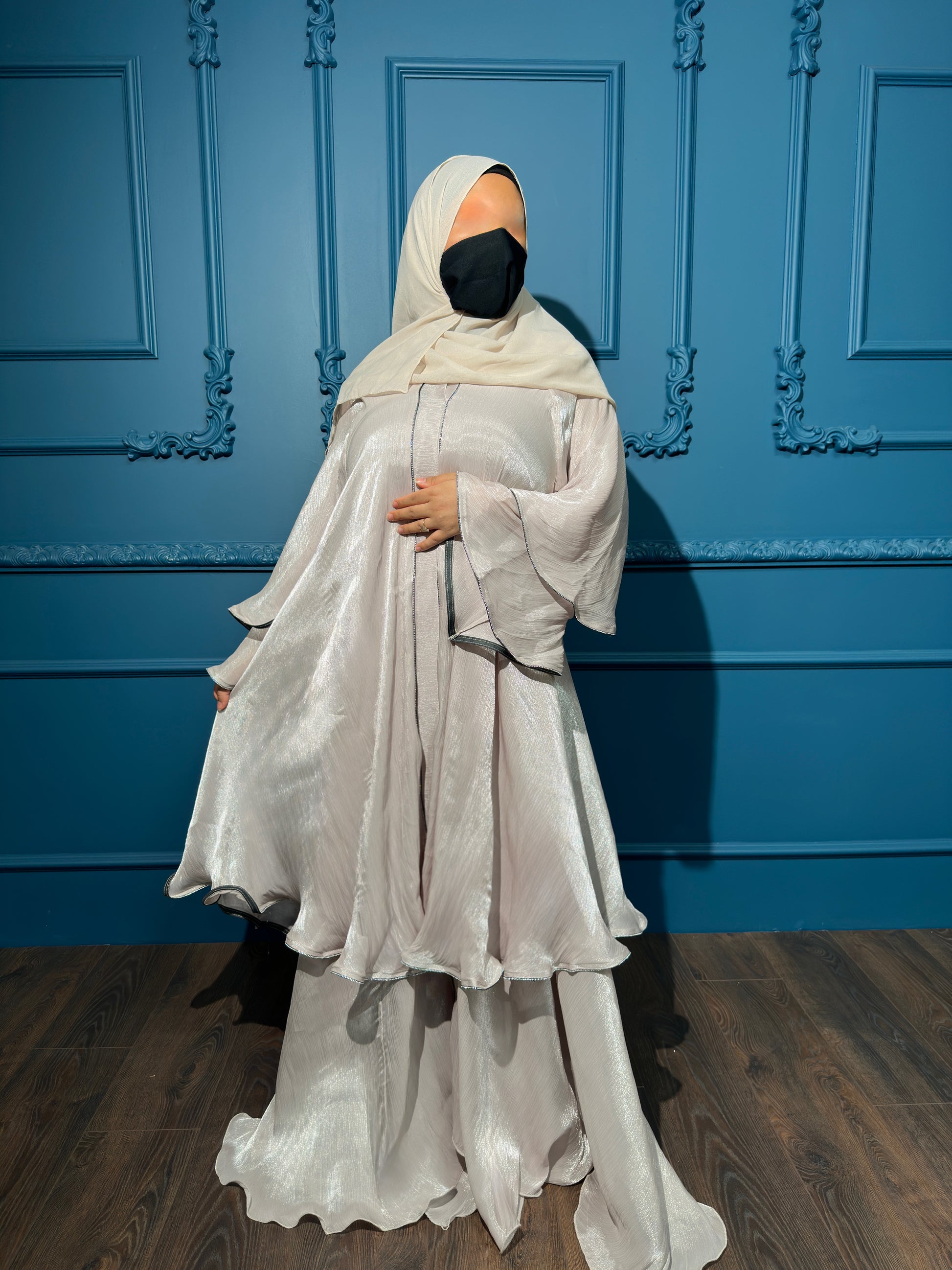 Sur les photos, la Abaya taupe est portée par un mannequin mesurant 1m76 (taille 60).